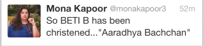 Home Mona Kapoor just announced on Twitter that Beti B’s been named Aaradhya Bachchan: Let the breaking news reels begin! Share this story: Click to share on Facebook (Opens in new window) Facebook Click to share on X (Opens in new window) X Click to share on Pinterest (Opens in new window) Pinterest Click to email a link to a friend (Opens in new window) Email More Click to share on Tumblr (Opens in new window) Tumblr Click to share on Reddit (Opens in new window) Reddit Click to share on LinkedIn (Opens in new window) LinkedIn Like Loading... Related