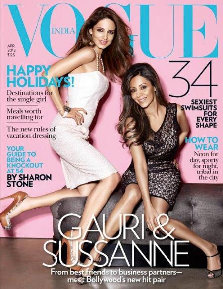 Gauri Khan will be retailing some design works in partnership with Suzanne Roshan’s Charcoal Project. The ladies recently shot for the April cover of Vogue India. Here’s a preview of the cover and an accompanying video: